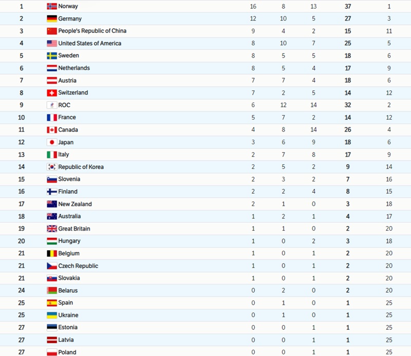 Ο τελικός πίνακας των μεταλλίων στο Πεκίνο 2022