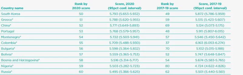 Οι σκανδιναβικές χώρες εμφανίζονται τακτικά στην πρώτη πεντάδα -πέρυσι ήταν και πάλι πρώτη η Φινλανδία-, ενώ οι χώρες σε εμπόλεμες ζώνες και κράτη της Υποσαχάριας Αφρικής καταλαμβάνουν συνήθως τις τελευταίες πέντε.