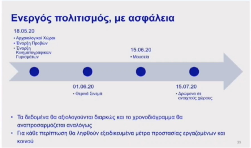 Όπως ανακοίνωσε η Λίνα Μενδώνη στις 18 Μαΐου ανοίγουν οι αρχαιολογικοί χώροι, αρχίζουν οι πρόβες και τα γυρίσματα. Την 1η Ιουνίου ανοίγουν τα θερινά σινεμά και στις 15 Ιουνίου ανοίγουν τα Μουσεία. Στις 15 Ιουλίου αρχίζουν τα δρώμενα σε ανοικτούς χώρους.