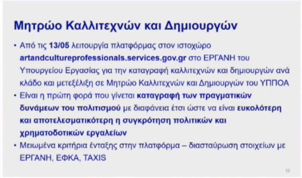 Όπως είπε ακόμη η Λίνα Μενδώνη δημιουργείται μητρώο καλλιτεχνών.