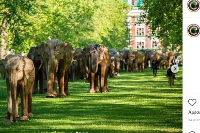 Εξήντα «ελέφαντες» περνούν από το Green Park του Λονδίνου, μεταξύ Piccadilly και Buckingham Palace...