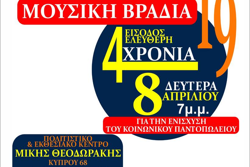 διοργανώνει την Δευτέρα 8 Απριλίου στις 7 μ.μ. Με ΕΛΕΥΘΕΡΗ ΕΙΣΟΔΟ στο Πολιτιστικό &