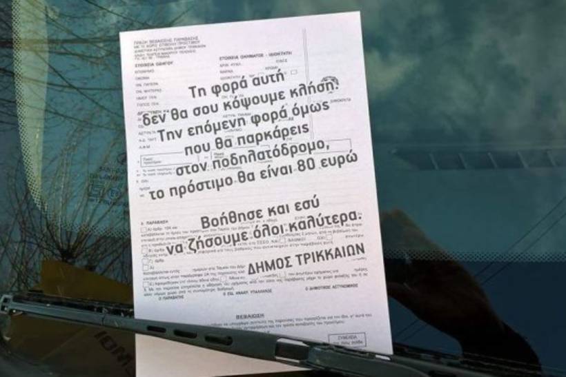 Η Δημοτική Αστυνομία Τρικάλων αφήνει προειδοποιητικά σημειώματα ότι την επόμενη φορά, ενδεχομένως θα σου κόψει κλήση